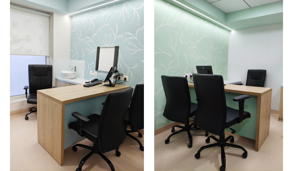 • Consultation rooms feature soft pastel floral wallpaper paired with minimalistic furniture. This restrained approach allowed the colour themes to take prominence, creating a tranquil and visually appealing space for both patients and doctors.