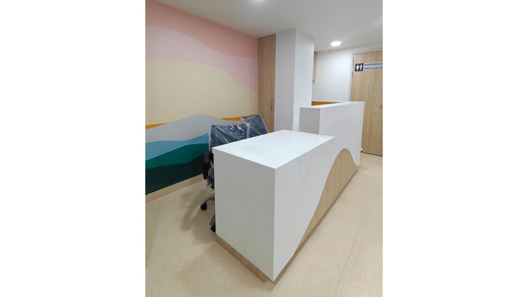 • The OPDs and recovery ward feature a pastel-themed colour palette, complemented by minimalistic furniture design. This clean, uncluttered aesthetic creates a serene and welcoming atmosphere, supporting both patient relaxation and smooth clinical operations.