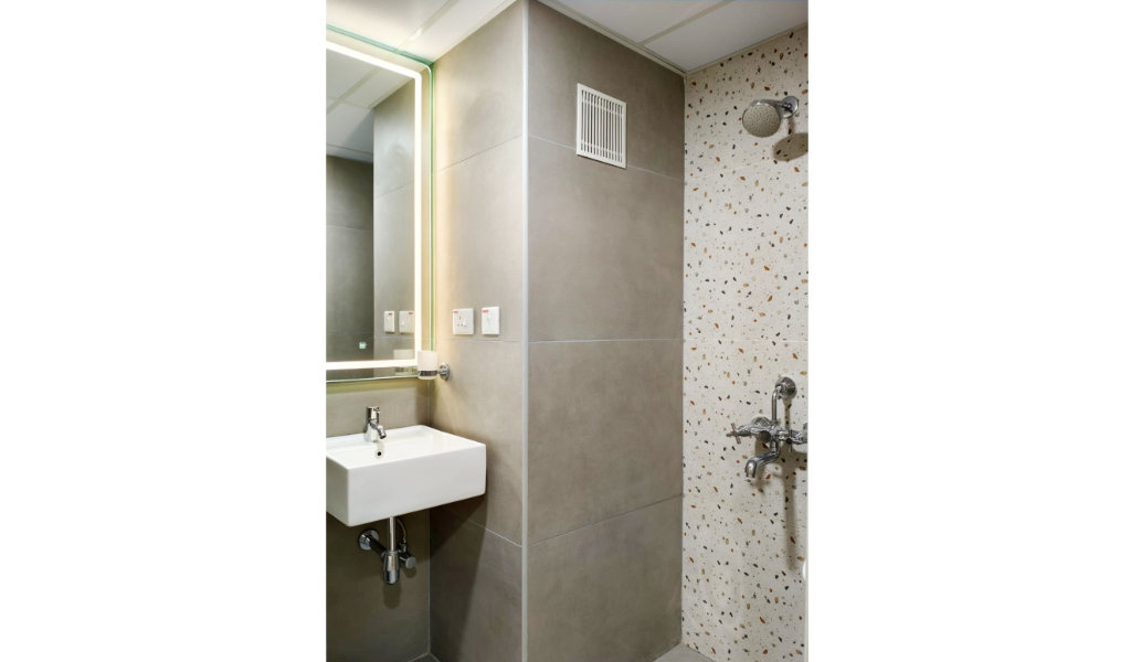 • Flooring was also used as a key design feature: corridors are finished in clean white vinyl, accented with wave patterns in soft pastel shades drawn from the overall colour theme, adding subtle movement and interest to the space.