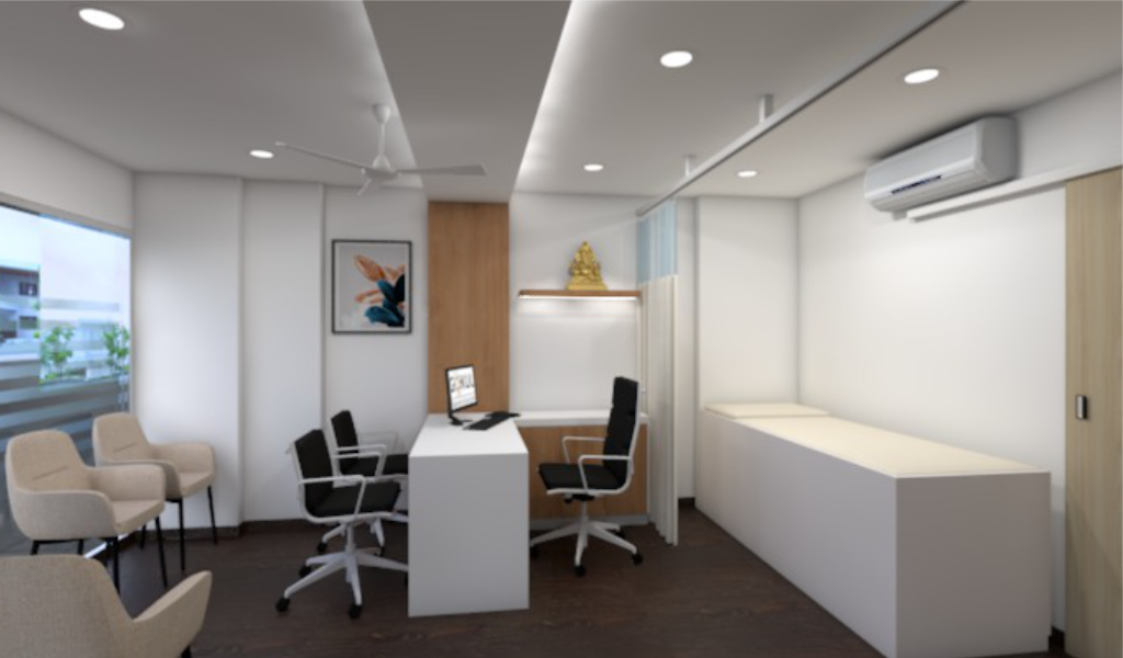 - Above the OPD desk, a rectangular cove ceiling with warm cove lighting enhances the ambience.